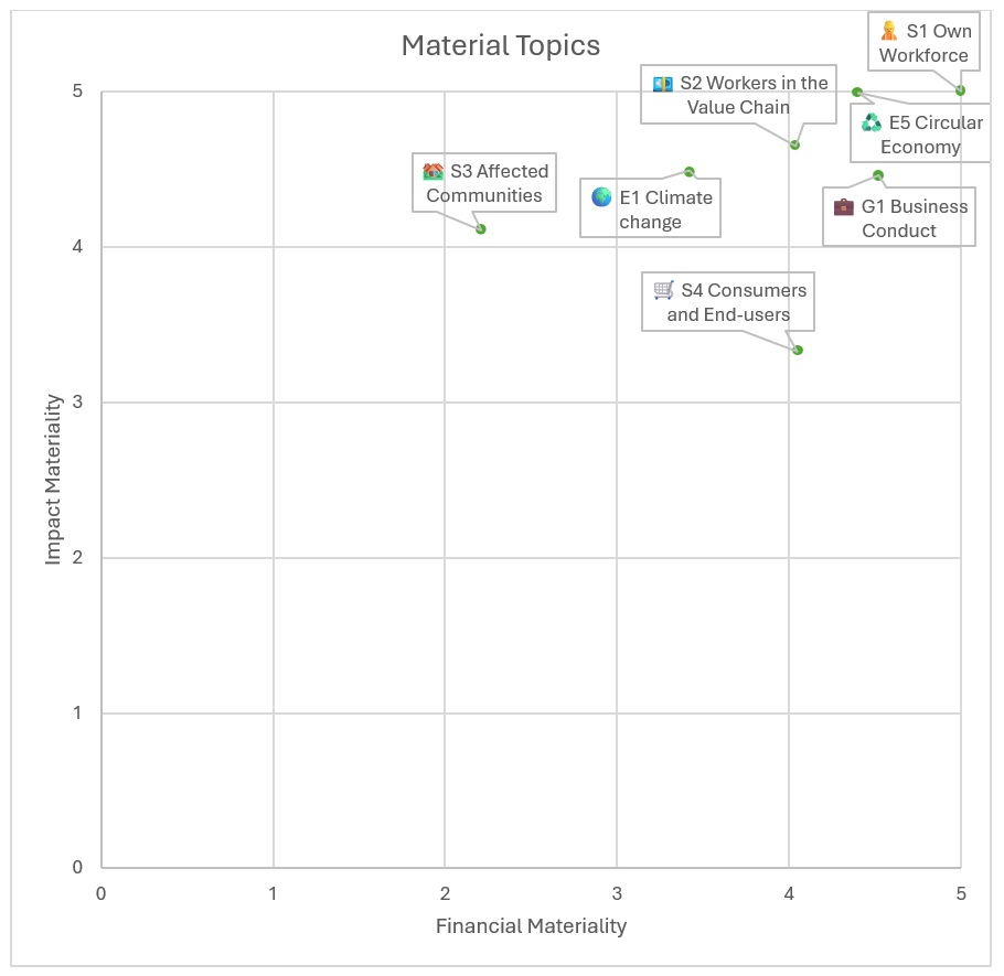 Une Double Materiality Assessment examine la durabilité sous deux angles : comment notre entreprise impacte le monde (impact materiality) et comment les changements environnementaux et sociaux affectent notre entreprise (financial materiality). Cette double perspective est au cœur de la Corporate Sustainability Reporting Directive (CSRD) de l’UE, et nous l’avons saisie comme une occasion d’écouter — vraiment écouter — les personnes qui connaissent le mieux notre entreprise.